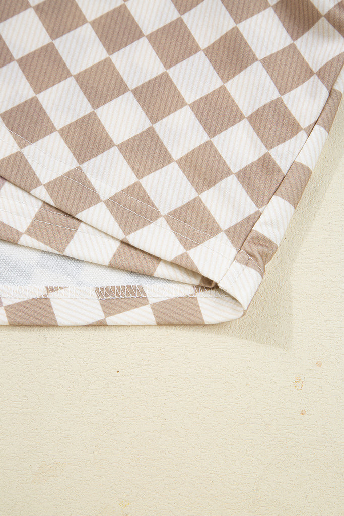 Khaki Checkered Long Sleeve Crop Top High Waist Skort 2pcs Set
