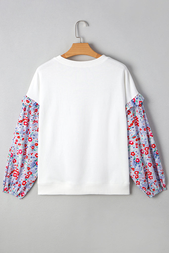 White Floral Ruffled Balloon Sleeve Patchwork Loose Blouse