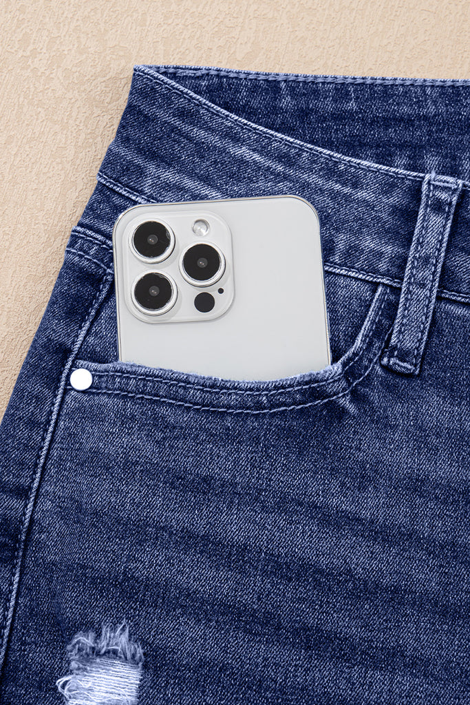 - Distressed high waist jeans for a trendy and edgy look.
