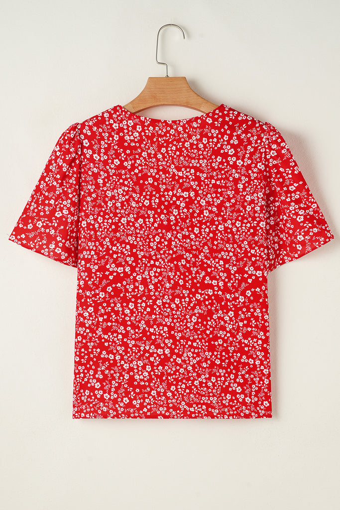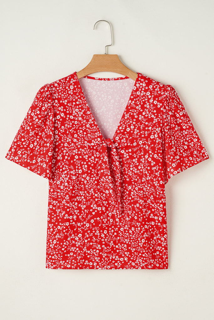 Red Boho Floral Printed Half Sleeve Knotted V Neck Blouse